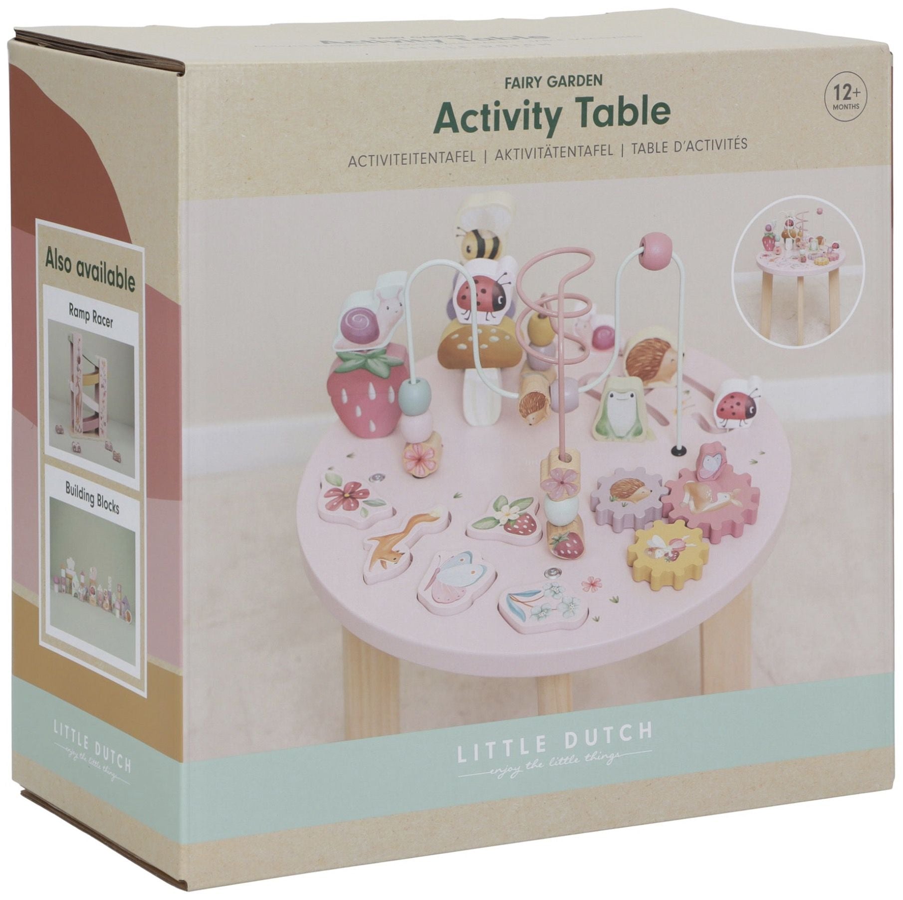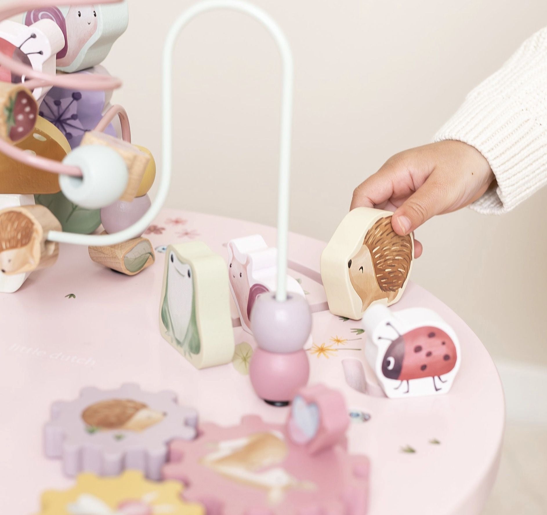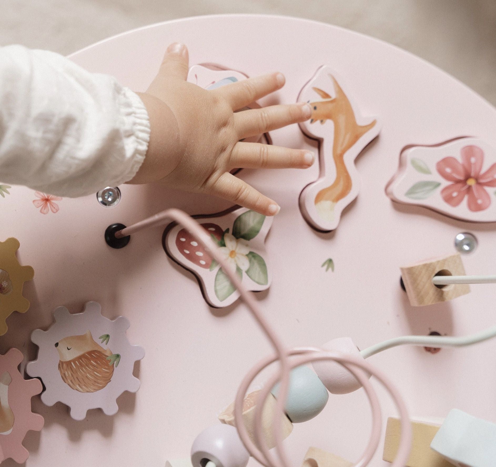 Масата включва 5 различни активности, всяка от които подпомага развитието на фината моторика, координацията и концентрацията. Благодарение на стабилния и безопасен дизайн, активната маса насърчава детето не само да играе, но и да се изправя и стои стабилно, което я прави идеална за деца в етапа на активно развитие.
