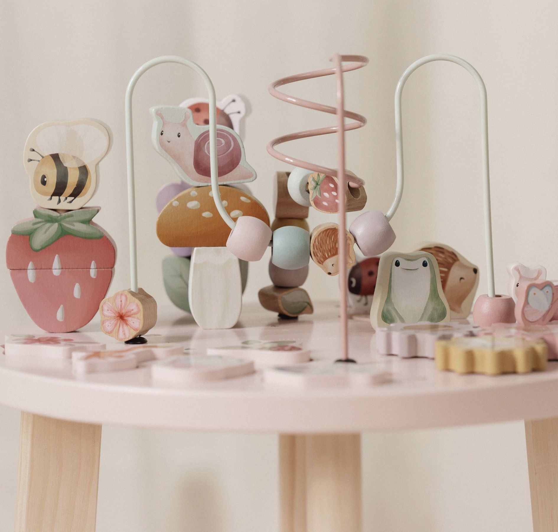 Събуди се и започвай с играта! Дървената активна маса предлага свят от забавления и открития, които ще държат вашето дете ангажирано отново и отново. Премествай мъниста по спиралата, подреждай ферма, решавай пъзел, върти зъбни колела и играй с малката овца, крава и пиле.