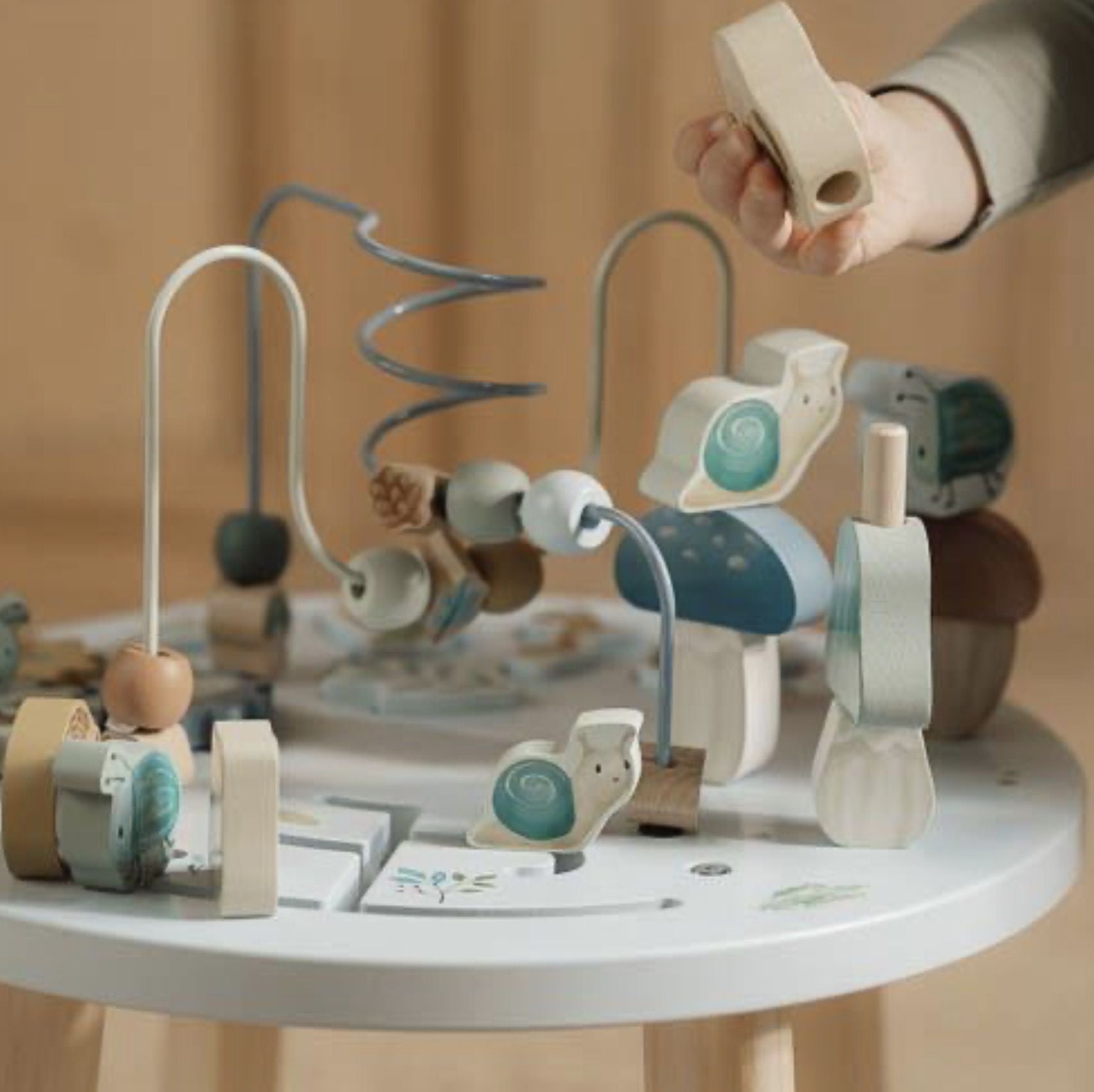 Събуди се и започвай с играта! Дървената активна маса предлага свят от забавления и открития, които ще държат вашето дете ангажирано отново и отново. Премествай мъниста по спиралата, подреждай ферма, решавай пъзел, върти зъбни колела и играй с малката овца, крава и пиле.