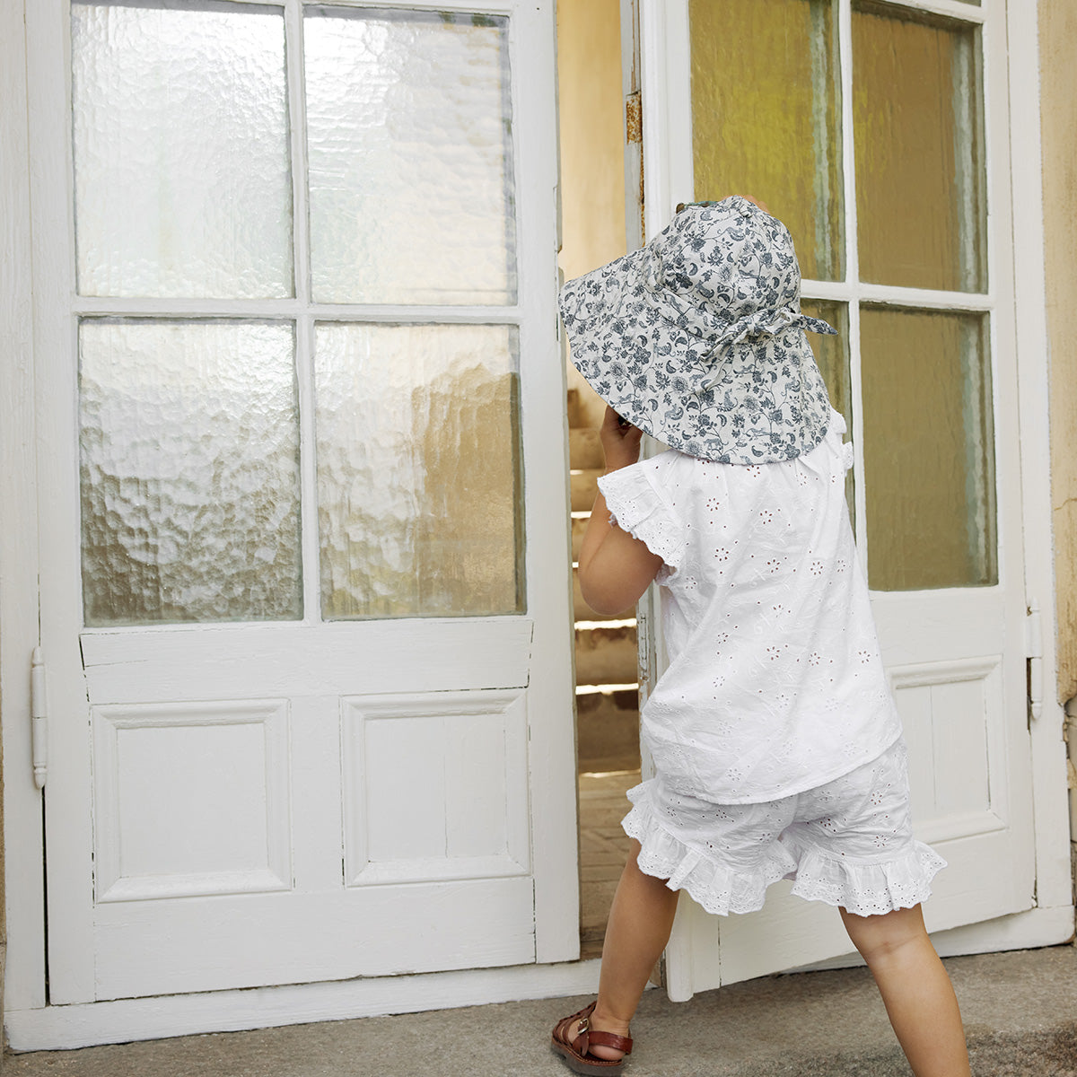 Предпазващата шапка за слънце Elodie е изработена от 100% памук, който осигурява мекота и комфорт при носене. Удължената задна част на периферията осигурява допълнителна защита за врата.