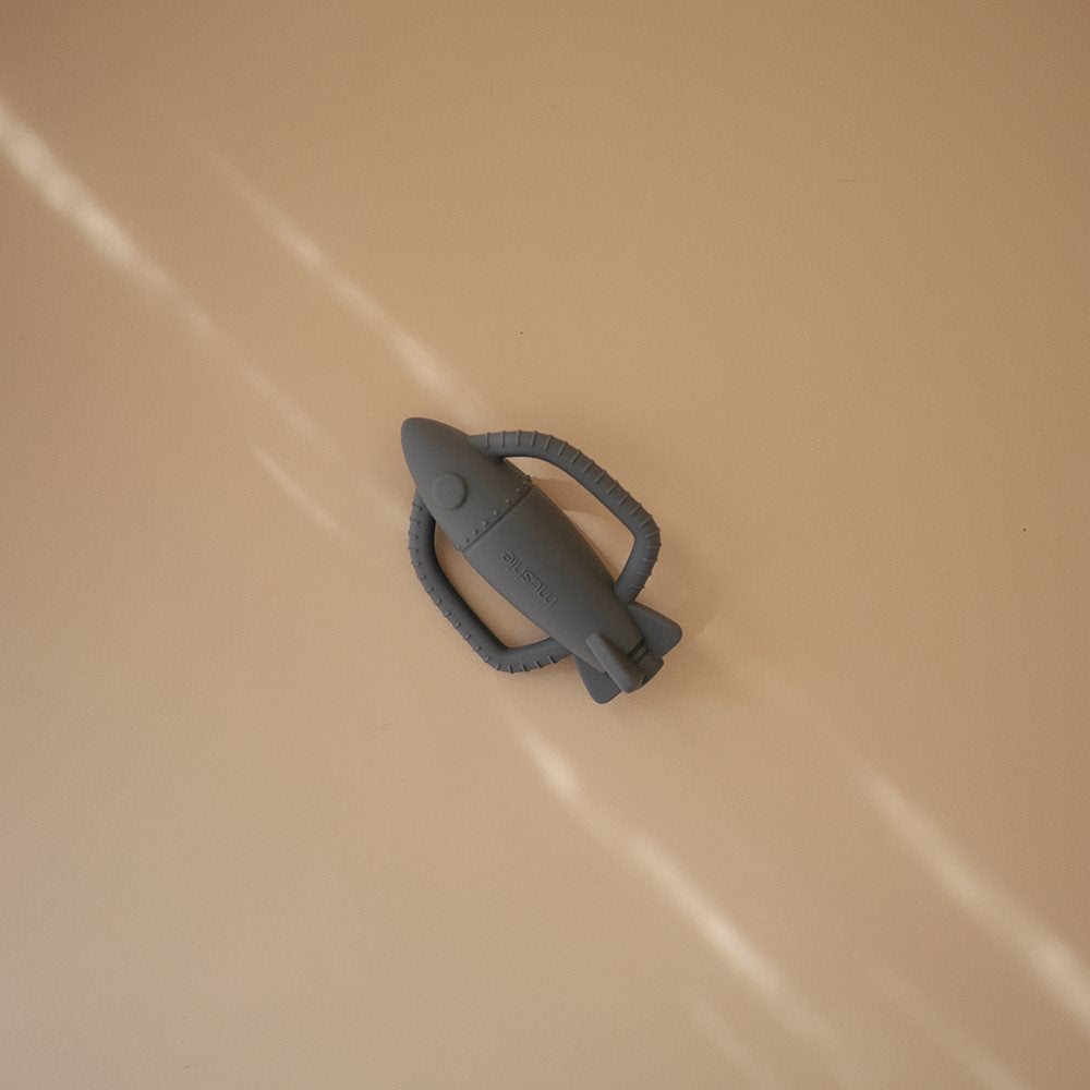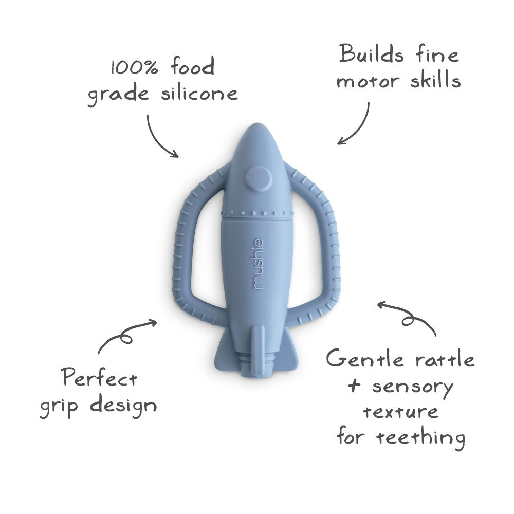 Подарете на вашето мъниче успокояващо и сетивно изживяване с гризалката–дрънкалка Mushie Rocket, вдъхновена от космоса!