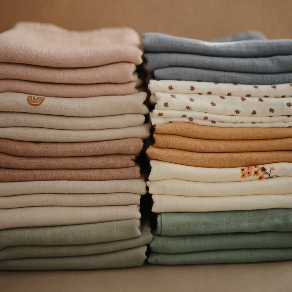 Леки и дишащи муселинови пелени от 100% органичен памук с допълнителен мек слой. Те са изключително практични за ежедневна употреба – могат да се използват на повивалника, в чантата за пелени или за почистване на малки бъркотии.