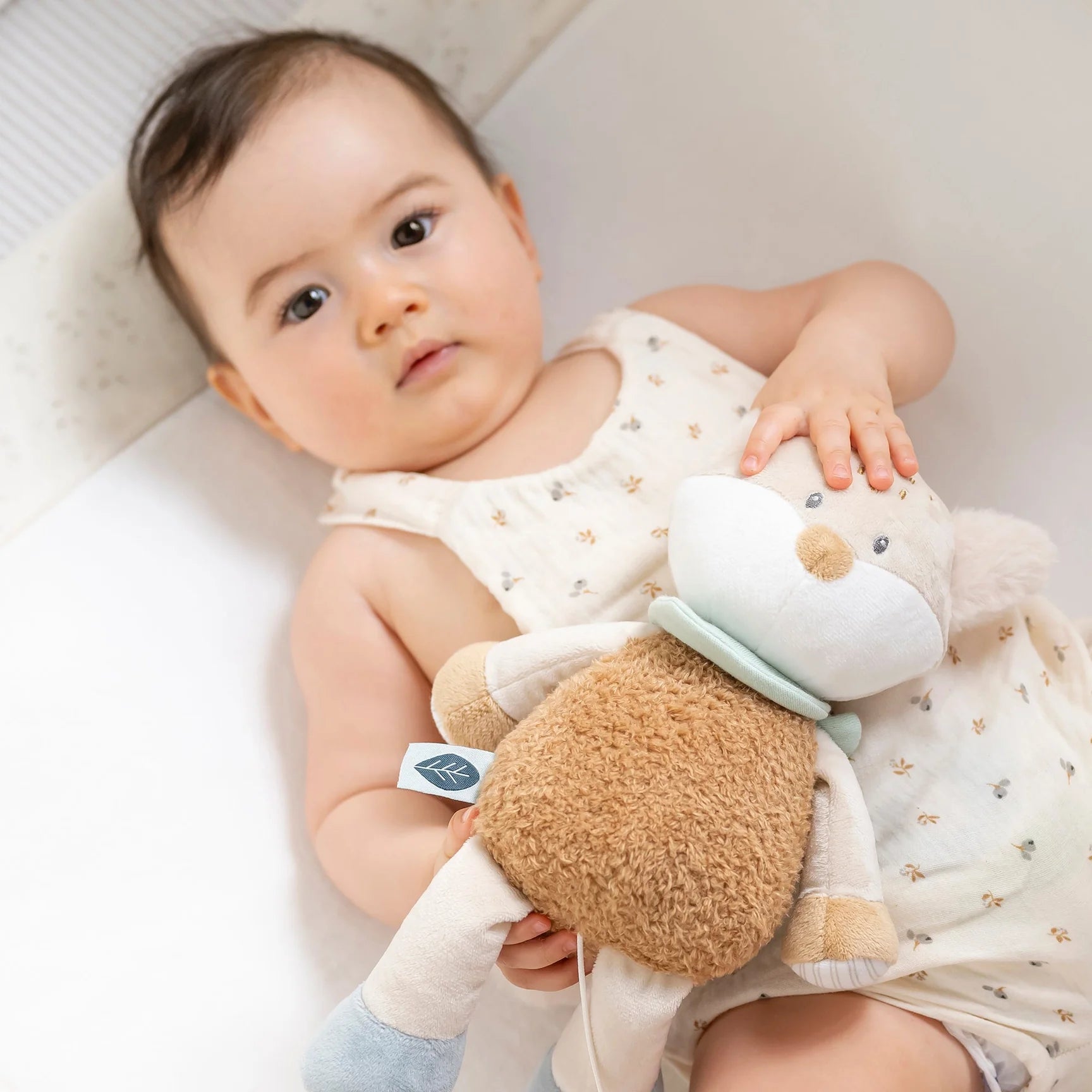 Красивата музикална гушлива играчка FLO с нежни цветове и сладък дизайн е чудесен приятел за игра и успокоение на бебето. Меката плюшена повърхност я прави изключително приятна за гушкане, а вградената музикална кутия ще зарадва малкото с нежната мелодия „La-Le-Lu“.