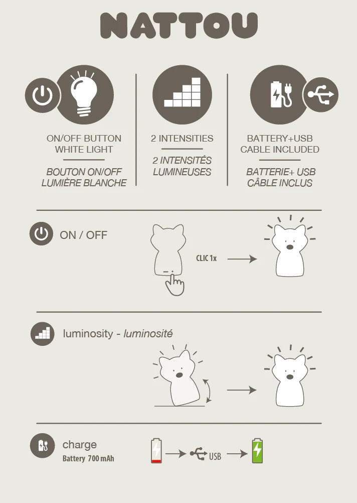 За сладки сънища и нежно заспиване – това сладко LED нощно осветление от Nattou е идеалният спътник в ежедневието с бебета и деца. Нощната лампа свети с 2 регулируеми нива на светлина, а симпатичното животинче, изработено от BPA-free веган силикон, е изключително меко на допир и не загрява.